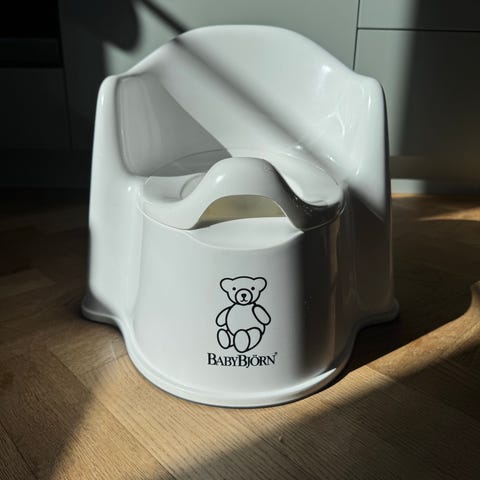 Säljer vår ”extra potta”, knappt använd. Här kommer beskrivningen: Babybjörn potta i blått med vit insats. Pottan har avtagbar innerdel som underlättar tömning och rengöring. Stabil konstruktion med ryggstöd och stänkskydd framtill. Passar barn vid potträning i hemmet.