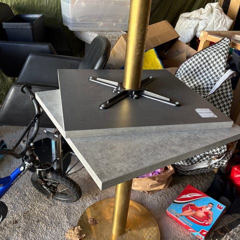 bord med fyrkantig bordsskiva i trä och svart metallstativ. Bordsskivan har mörk träyta och vilar på ett centralt ben med kvadratisk fot i metall. Passar exempelvis som cafébord, matbord eller arbetsbord i kök, vardagsrum eller offentliga miljöer.