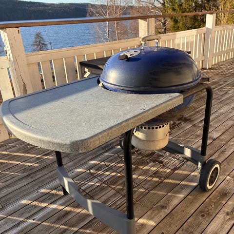 Weber klotgrill för kol i svart färg. Grillen har lock med ventil, grillgaller i metall och uppsamlingsfat för aska under grillen. Utrustad med två hjul och handtag för enklare förflyttning. Passar för grillning utomhus på altan, uteplats eller i trädgård.