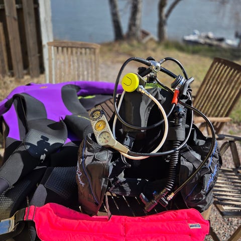 Västar av fabrikat Sea Quest, regulatorer och octypuss är Mares.