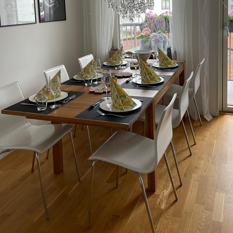 6 st stolar varav en har gått sönder i fästet mellan benen och sitsen, går garanterat att limma. I övrigt väldigt bra skick.
