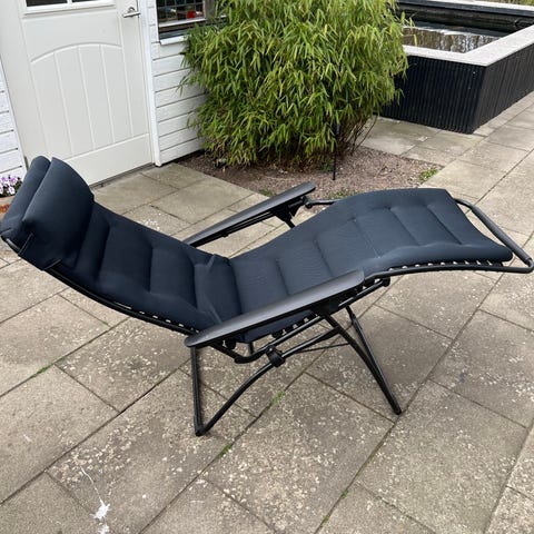 FIAM / Amigo XXL solsäng i svart textiline med aluminium stomme,Solstolen är hopfällbar och har justerbart ryggstöd samt avtagbar huvudkudde. Passar för användning utomhus på altan, balkong eller i trädgård. Är använd i en sommar så i väldigt gott skick. Nypris 3995:-