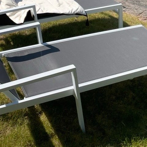 Solstol/solsäng i grå konstrotting med grå dyna. Ryggstödet är ställbart i flera lägen med metallstöd. Passar för användning på altan, terrass eller vid pool. Sängen har rektangulär form och låg höjd mot marken med integrerad liggdel och ryggdel i ett stycke.