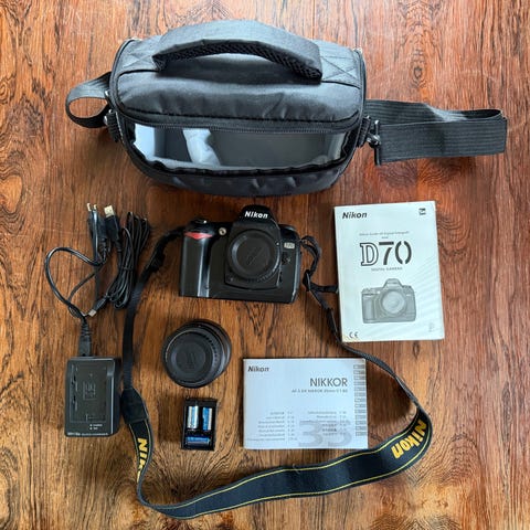På bilderna syns även kamerarem, objektivlock, batteri, laddare, manual för Nikon D5200 samt en vadderad kameraväska med avdelare. Exakta tekniska specifikationer som upplösning och serietagning följer standard för Nikon D5200-modellen.