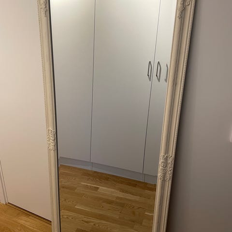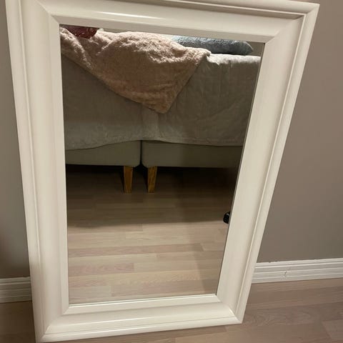 Jysk spegel med dekorativ vit ram. Rektangulär spegel med profilerad och ornamenterad ram i klassisk stil. Ramen är vit med detaljerade dekorationer i hörn och kanter. Spegeln kan användas stående mot vägg eller monteras på vägg med medföljande beslag och skruvar, lämplig för exempelvis vardagsrum, hall eller sovrum.