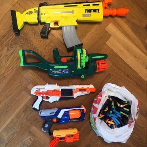 Nerf leksaksvapen set med flera skumdartblasters i plast. Setet innehåller två olika Nerf-blasters 2 at pistoler i olika färger samt en påse med lösa skumpilar. Lämpligt för lek och dartskjutning utomhus eller inomhus enligt tillverkarens rekommendationer. Används med kompatibla Nerf-skumdartpilar och bör hanteras enligt säkerhetsanvisningar, till exempel att inte sikta mot ansikte eller ögon.