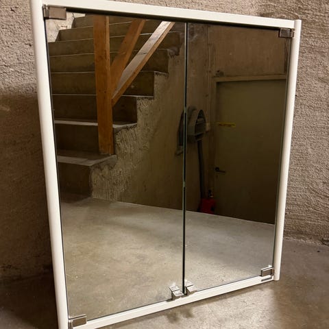 Badrumsskåp med spegel samt 5 hyllpan. Höjd: 195 cm med ben (mått ben: justerbart 15-16 cm), Bredd:30 cm, Djup: 21 cm.