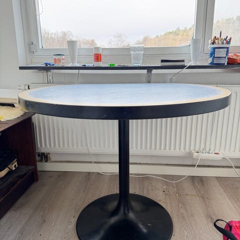 Runt matbord i terrazzo sten. Bordet är tungt och står väldigt stabilt.