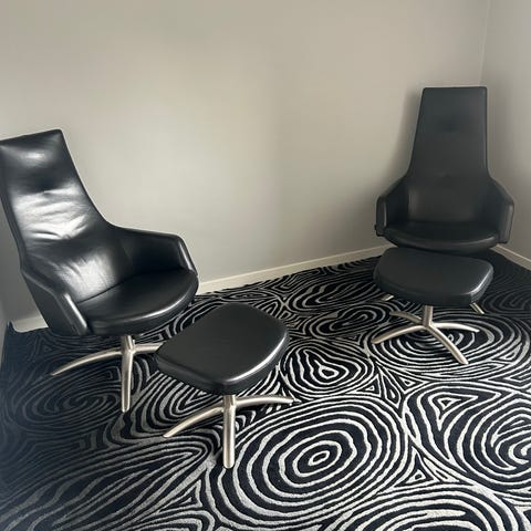 Conform fåtölj i svart läder med snurrstativ i metall. Fåtöljen har en formad sits och rygg med lätt svankstöd. Klädseln är slät med diskreta sömmar och stoppad för bekväm sittkomfort. Underredet består av ett kryssformat metallstativ som ger stabilitet och gör att fåtöljen kan roteras. Passar som loungefåtölj i vardagsrum, kontor eller vilohörna.