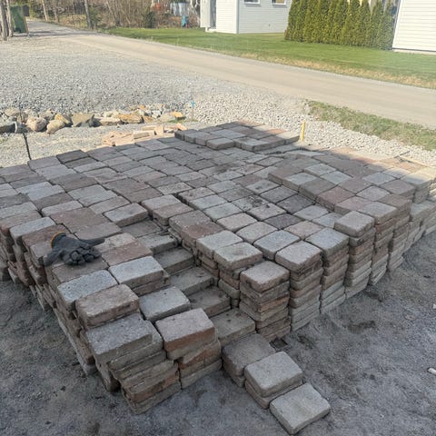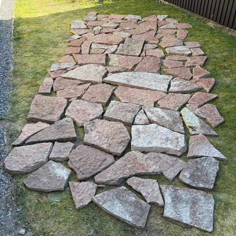 Marksten i grå nyans, lämplig för uppfart, gång och uteplats. Stenarna är rektangulära och lagda i förband, vilket ger en jämn och stabil yta. Passar för användning runt hus, vid entré, gångar och parkeringsyta. Kan användas för nyanläggning eller komplettering av befintlig stenläggning.