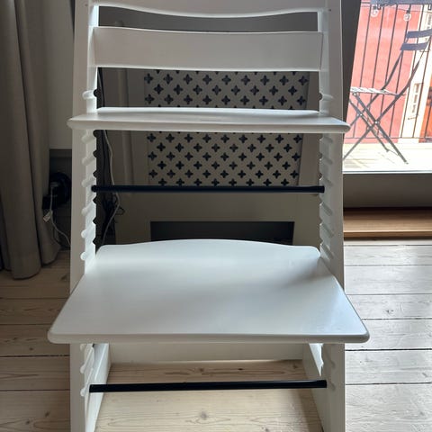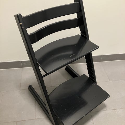 Stokke Tripp Trapp matstol i mörkbrunt trä. Justerbar barnstol där både sits och fotstöd kan höjdjusteras för att passa barn i olika åldrar. Stolen är utformad för att barnet ska kunna sitta vid bordet tillsammans med resten av familjen. Endast använd av ett barn, mycket bra skick.