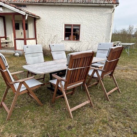 Brafab trädgårdsgrupp i teak. Gruppen består av ett rektangulärt bord, flera fällbara stolar med armstöd samt en bänk med ribbad rygg och sits. Trämöblerna har en vädergrånad yta och är avsedda för utomhusbruk i trädgård eller på uteplats. Två mindre fällbara sidobord i samma stil ingår, lämpliga som avlastningsbord bredvid sittplatserna.