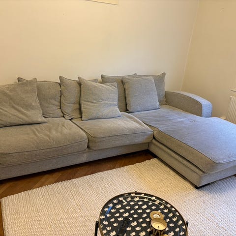 Tyget heter Alex grey och är väldigt slitstarkt men mjuk och behaglig. Rejäl stoppning som är mjuk men formbar och fyllig.