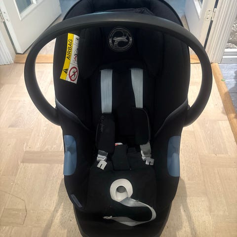Cybex babyskydd bilbarnstol för barn upp till cirka 13 kg (grupp 0+). Modellen är ett bakåtvänt babyskydd som monteras i bilen tillsammans med basen som syns på bilderna. Babyskyddet har bärhandtag, internbälte med flera fästpunkter och sidokrockskydd. Klädseln är i svart tyg. Passar för användning från nyfödd upp till dess att barnet växer ur vikt- eller längdgränsen enligt tillverkarens rekommendationer. Basen ger en fast monteringspunkt i bilen och underlättar i- och urtagning av babyskyddet.