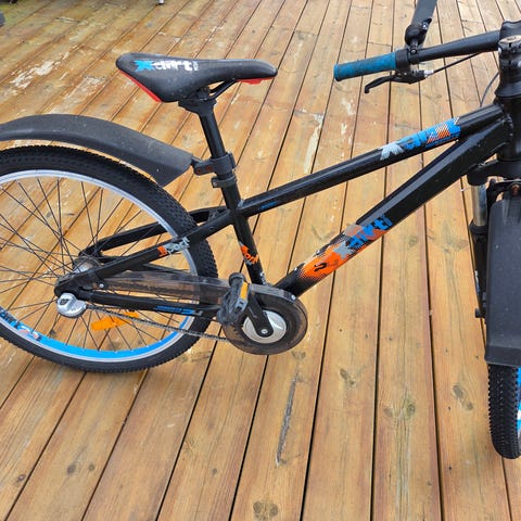 Scott mountainbike 24" hjul. Cykeln har orange ram med blå detaljer, rakt styre med handbromsar. Utrustad med grovmönstrade däck som passar för både väg och lättare terräng.