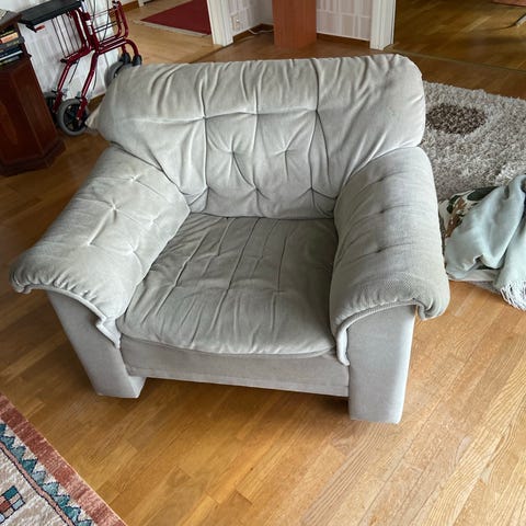 Fåtölj i beige läder. Rymlig modell med kraftigt stoppade armstöd, sits och ryggstöd. Passar som sittplats i vardagsrum eller läshörna. Står på korta ben och har rundad front samt markerade sömmar längs kanterna.