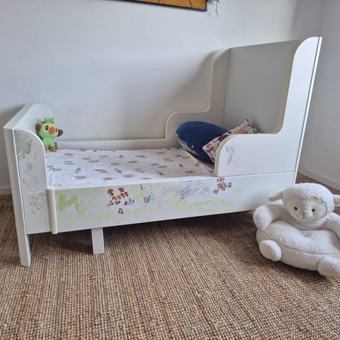 JLY skötbord i vit färg inkl bädd. Skötbordet har två öppna hyllplan under skötytan för förvaring av blöjor, kläder och tillbehör.