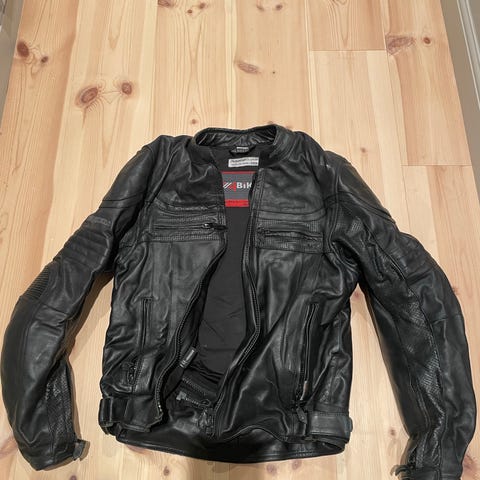 RST Brighton mc-jacka , herrmodell i storlek L (UK 44 / EU 54). Jackan har dragkedja framtill, ståkrage och vadderade partier vid axlar och armbågar. Jackan har även ett integrerat ryggskydd och löstagbart foder.