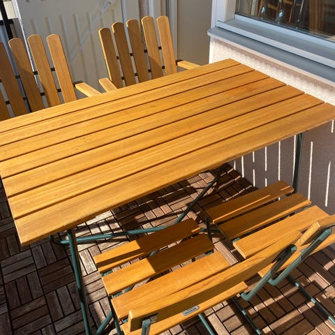 Grythyttans serie här med rektangulärt bord och fyra stolar. Inköpt för ca 10 år sedan. Utförande i lackad ek där bordsskivan är mest slitet. Stativen på både bord och stolar och i gott skick (robust zink). Stolarna är fällbara och passar för både altan, uteplats och trädgård. Träytorna visar viss patina och slitage, se bilder för detaljerat skick. Nypris: cirka 20 000 kronor.