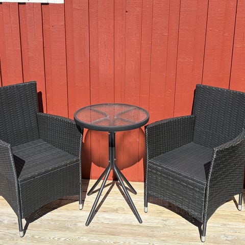 Caféset med runt bord och två stolar, Bordsskivan är i klarglas med metallstativ. Stolarna har svart flätad sits och rygg i konstrotting med metallram.