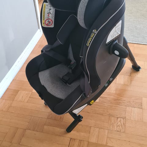 Bilbarnstolen är bakåtvänd och försedd med intern 5-punktssele. Färgen är svart med ljusa detaljer. Stolen har stödben och ISO-fix fästen för montering i bilen. Klädseln är vadderad för ökad komfort.