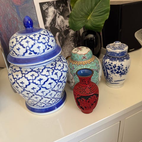 Asiatisk samling prydnadssaker - burkar, bambukorgar, keramik.