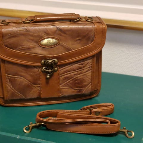 Ny axelväska i läder för unisex. Väskan är i marinblått läder med kontrasterande sömmar. Den har ett bärhandtag upptill samt en avtagbar axelrem med karbinhakar. På framsidan finns flera ytterfack, bland annat ett större fickfack och ett smalare fack som kan passa mindre tillbehör.