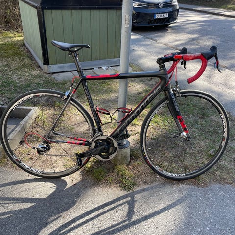 Säljer en Cannondale SuperSix EVO Disc i storlek 58. Kolfiberram och gaffel. Lätt, styv och snabb landsvägscykel i mycket bra skick.