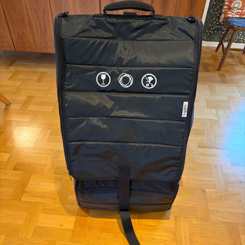 Bugaboo transportväska i svart färg. Det finns även en separat väska för barnvagnens hjul.