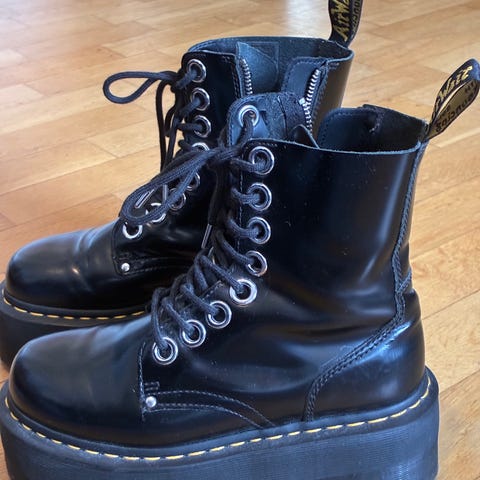Dr. Martens stövlar i svart läder, storlek 39. Kängor med snörning framtill, dragkedja vid sidan och kraftig platåsula med grovt mönster. Passar för vardagsbruk och utomhusaktiviteter där stabilitet och slitstyrka önskas. Endast testade inomhus. Nypris 2800kr.