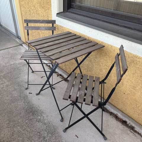 Bistro caféset med ett fyrkantigt bord och två stolar i grå metall. Både bord och stolar är fällbara för enkel förvaring. Passar för uteplats, balkong eller trädgård. Sits och bordsskiva består av ribbor i metall, och stolarna har ryggstöd med två ribbor som ryggstöd.