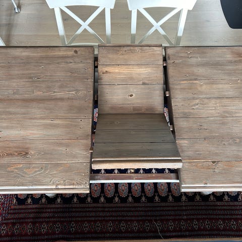 Matbord i ljusgrå färg med svarta ben. Bordsskivan är slät med markerade skruv- eller nitdetaljer längs kanterna. Benen är svarvade och ger ett klassiskt uttryck. Massivt.