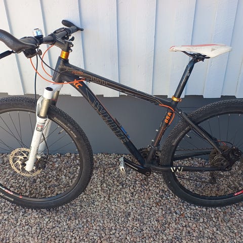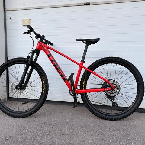 Trek mountainbikemed ramstorlek S och 27,5" hjul. Använd två säsonger. Allt funkar bra, små repor efter användning.