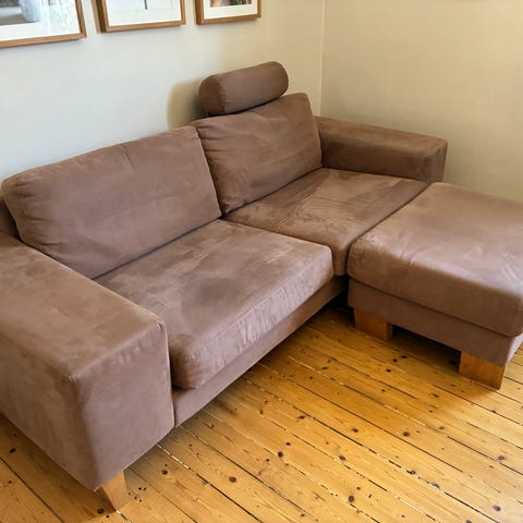 Ljusgrå tre-sits soffa med divan. Material tyg. Avtagbar klädsel som kan tvättas i maskin. Fötter i metall.