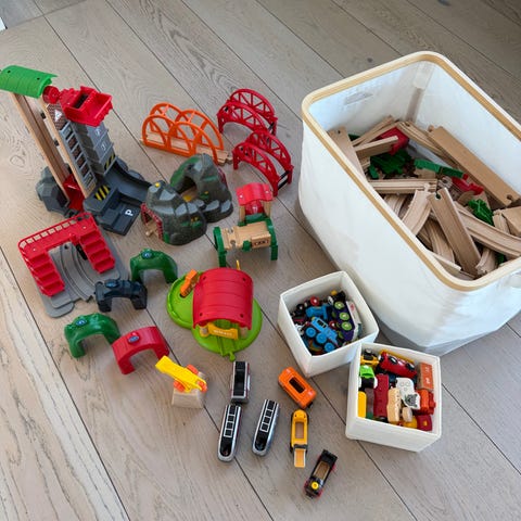 BRIO trätågbana stort set. Innehåller ett omfattande urval av raka och böjda träskenor, växlar och korsningar samt flera broar och tunnlar. Flera olika tåg och vagnar i trä och plast, både godståg och passagerartåg, syns på bilderna.
