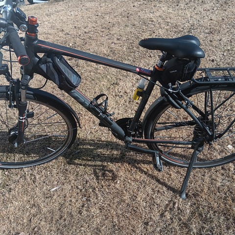 Nishiki hybridcykel med ramstorlek L och 28"/700c-hjul. Utrustad med utanpåliggande växlar (21), hydrauliska skivbromsar fram och bak, pakethållare bak samt stänkskärmar.