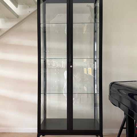 IKEA vitrinskåp i svart utförande med glasdörrar och glasväggar. Skåpet har 2 hyllplan som ger plats för förvaring och exponering. Stomme och ben är i metall med en matt svart yta.
