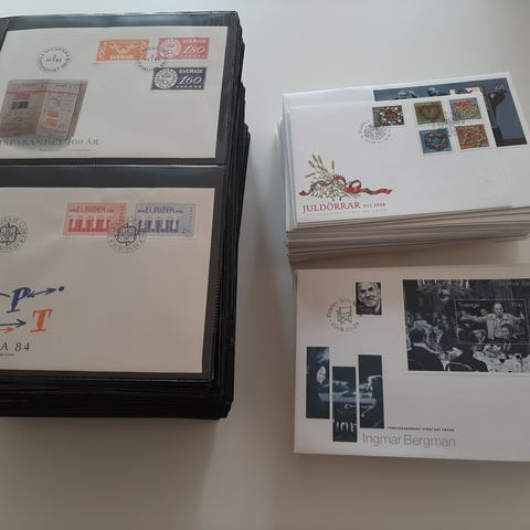Samling med svenska förstadagsbrev. Kuvert med frimärken och stämplar från olika utgåvor och motiv, bland annat tematiska serier som exempelvis djur och kultur. Lämpligt för frimärkssamlare eller den som vill komplettera en befintlig samling av svenska förstadagsbrev.