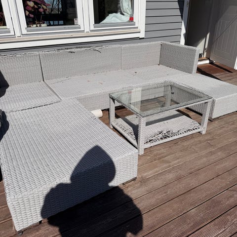 Sidobord i vit konstrotting med fyrkantig glasskiva. Bordet står på små fötter och är lämpligt för användning på balkong, altan eller uteplats. Passar som avlastningsbord bredvid soffa eller fåtölj. Material: konstrotting och glas. Färg: vit.