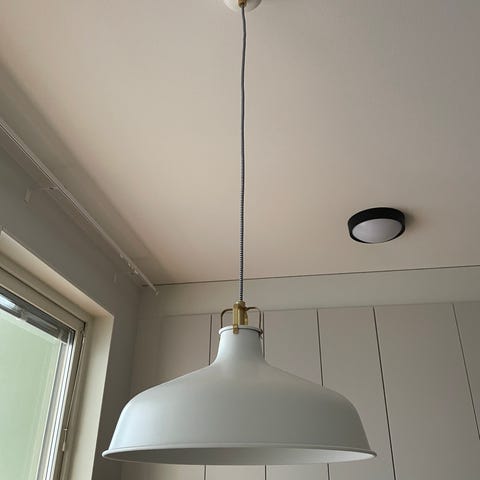 Taklampa i svart och mässing från IKEA, modell Ranarp. Nypris 399 kr.