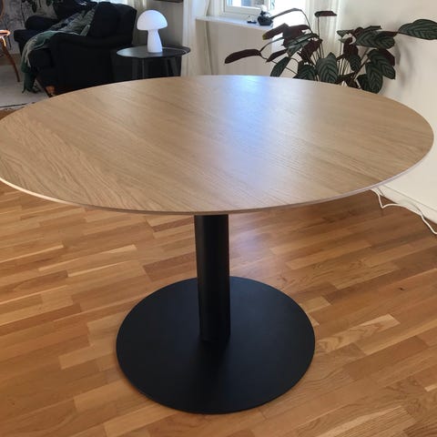 Mio matbord i runt utförande med utdragbar skiva. Bordsskivan är i ljus träton med ekmönstrad fanér och står på fyra runda ben i samma träutförande. Bordet kan användas både som runt bord och förlängas med iläggsskivor till ett större matbord. Passar som köksbord eller matbord i vardagsrum. Material: trä med ekfanér på bordsskivan. Färg: ljus ekträ.