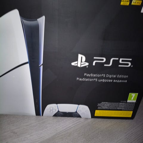 Sony Playstation 5 spelkonsol i vit färg. I bilderna syns konsol, originalkartong, en trådlös handkontroll samt två fysiska spel. Konsolen är avsedd för TV- och hemmabruk och stödjer moderna PS5-spel och multimediafunktioner. Alla kablar och tillbehör som ingår vid köp bör kontrolleras mot säljarens information.