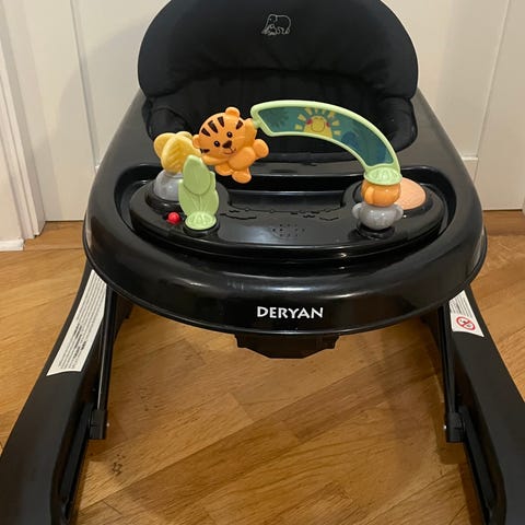 Gåstol utformad som en leksaksbil i färgerna vit, gul och svart. Sits med ryggstöd och öppning för benen. Främre delen har rattliknande handtag, knappar och små leksaker. Gåstolen står på en stabil bas med hjul som gör att barnet kan röra sig över golvet. Avsedd för små barn som stöd vid de första stegen och för lek inomhus. Hög rygg
