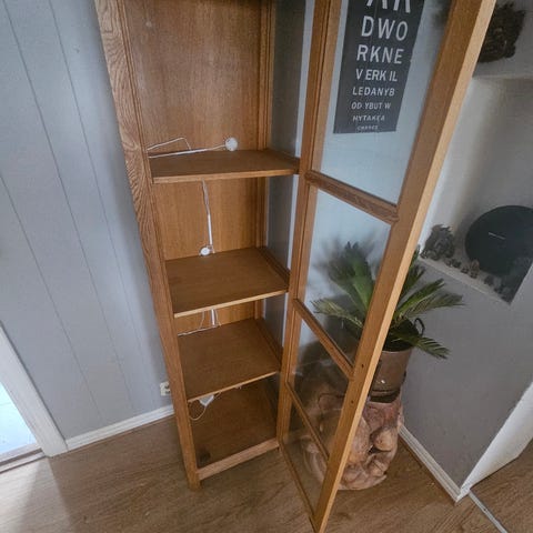Hylla i ek med glasdörr