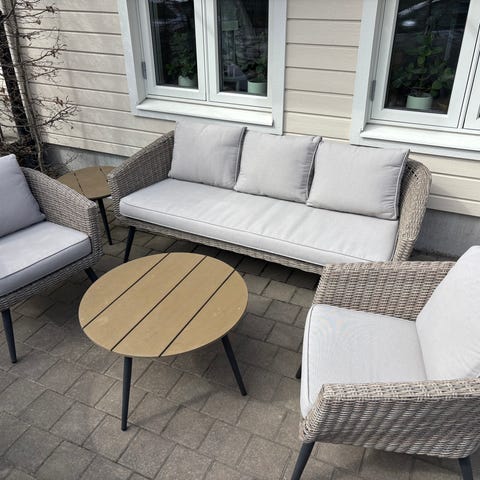 Bekväm soffa och fåtölj i konstrotting med grå dynor i bra skick. Endast använda på en inglasad balkong, nytvättade dynor. Litet svart bord.