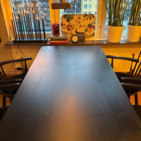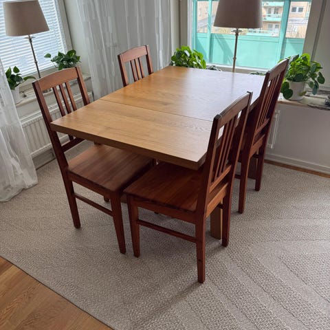 IKEA matgrupp bestående av Lisabo bord 140 cm x 78 cm med fyra stolar tillhörande stolar, bifogar enskild bild på en av stolarna. Bordet är använt, finns vissa mindre nötningar, men inget större. I övrigt skick enligt bilder.