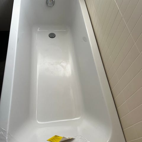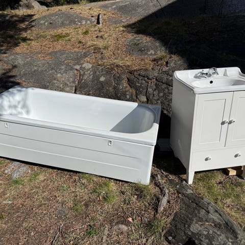 Badkar, handfat och toalett i matchande grön färg. Alla delar är i porslin och avsedda för montering i badrum. Badkaret är rektangulärt med frontpanel. Handfatet är vägghängt med synlig vattenlåsanslutning. Toaletten är vägghängd med lock och sits i samma färg som övriga delar. Passar för den som vill inreda eller uppdatera ett badrum med ett enhetligt, färgat sanitetsporslinset.