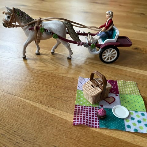 Hästvagn med accessoarer, pic-nic filt, häst och mat och en hund.