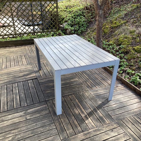 Matbord för utomhusbruk i trä och metall med dimensionerna B140D90H73. Bordet har några skavanker men de flesta borde maskeras av en inoljning. Två hörn har på ena sidan är något missfärgade (se bild 2).