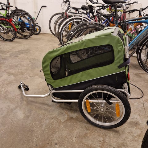 Cykelkorg med galler för transport av mindre husdjur. Korgen är i svart flätad design med metallgaller som lock och fästen för montering på cykel. Invändigt finns en löstagbar, mjuk dyna i grått tyg för ökad komfort. Gallret kan öppnas för enkel i- och urtagning av djuret. Lämplig för mindre hundar eller andra smådjur vid cykelturer.